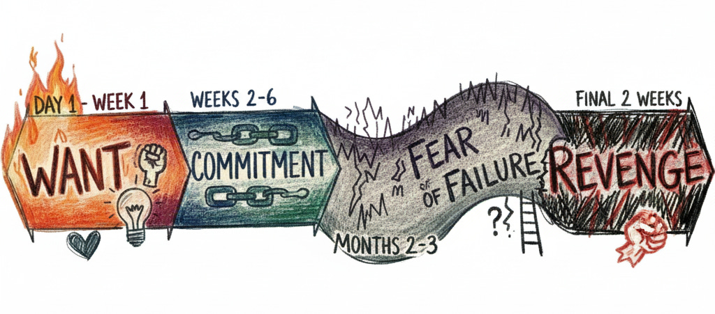 In my experience most projects start out with high emotions, and then proceed through commitment and resolve towards a gritty revenge arc against those people (aka your past self) who committed you to the endeavor in the first place.